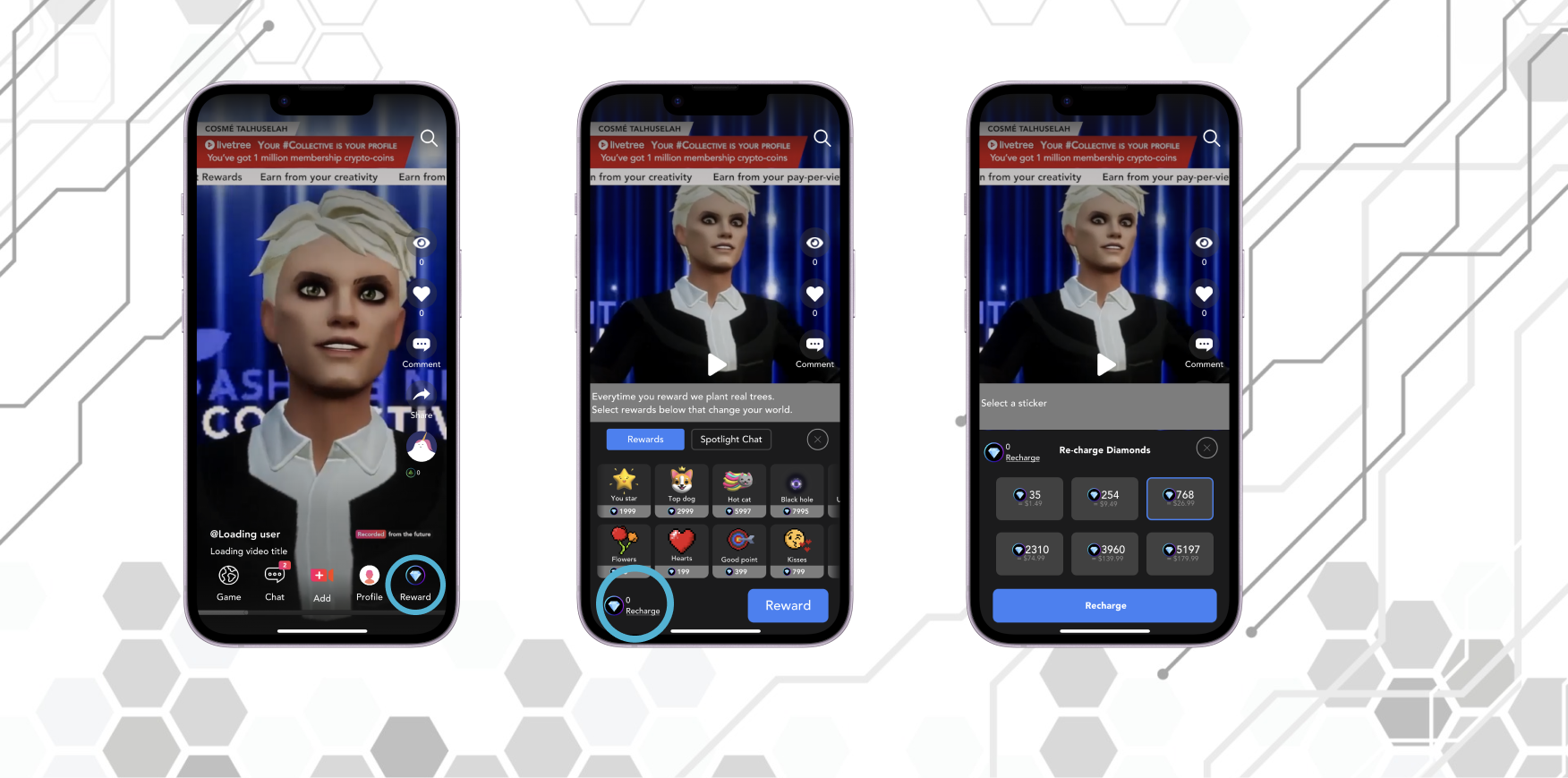 Diamond is the currency of the Livetree app. You can send e-gifts like flowers, buy event tickets, pin messages to your favorite creators, and become a member of your favorite collective with diamonds. You can buy diamonds with this simple steps